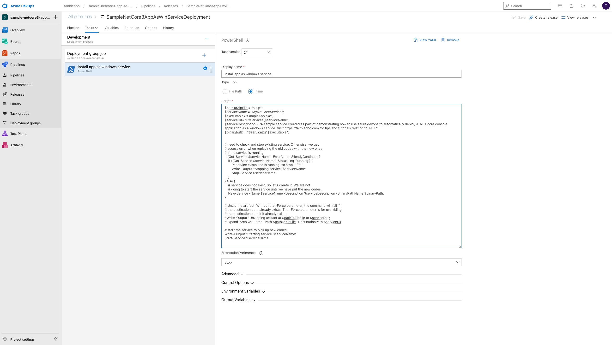 Below I show the setup of the release pipeline to automatically deploy the app as a windows service.