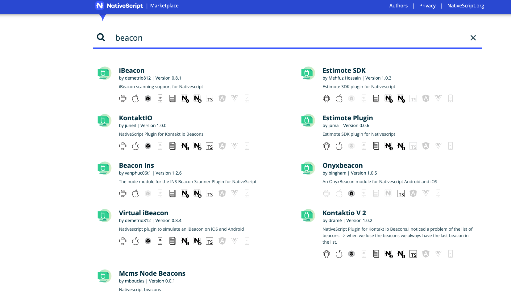 Both iOS and Android SDKs natively support scanning for iBeacons. For NativeScript, you can use a plugin or write your own. Fortunately, I found an existing plugin, the iBeacon plugin by demetrio812 which works and that is what I’m using.